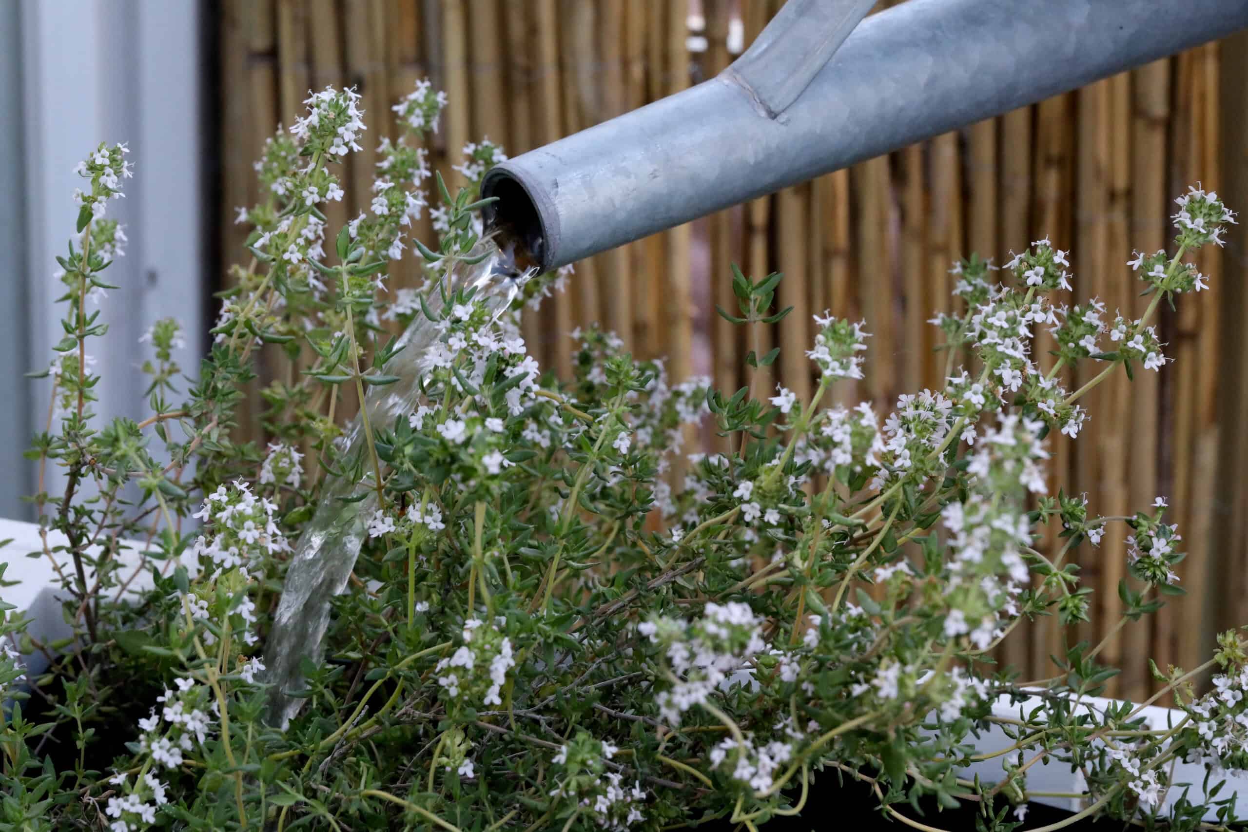 Der Wasserbedarf vom Thymian ist sehr gering. Das Kraut ist eine mediterrane, trockenheitsliebende Pflanze. Er sollte immer erst dann sparsam gegossen werden, wenn die obere Erdschicht ausgetrocknet ist. Wichtig ist beim Gießen unbedingt darauf zu achten, dass Staunässe vermieden wird. Diese führt nämlich zur Bildung von Wurzelfäule und Krankheiten. Für eine gute Drainage bietet es sich an, den Thymian in durchlässige, lockere Böden zu pflanzen und z.B. Sand oder Steine unter die Erde zu mischen. Im Topf trocknet die Erde natürlich etwas schneller aus als im Gartenbeet. Daher sollte hier die Feuchtigkeit häufiger kontrolliert werden und etwas regelmäßiger gegossen werden.