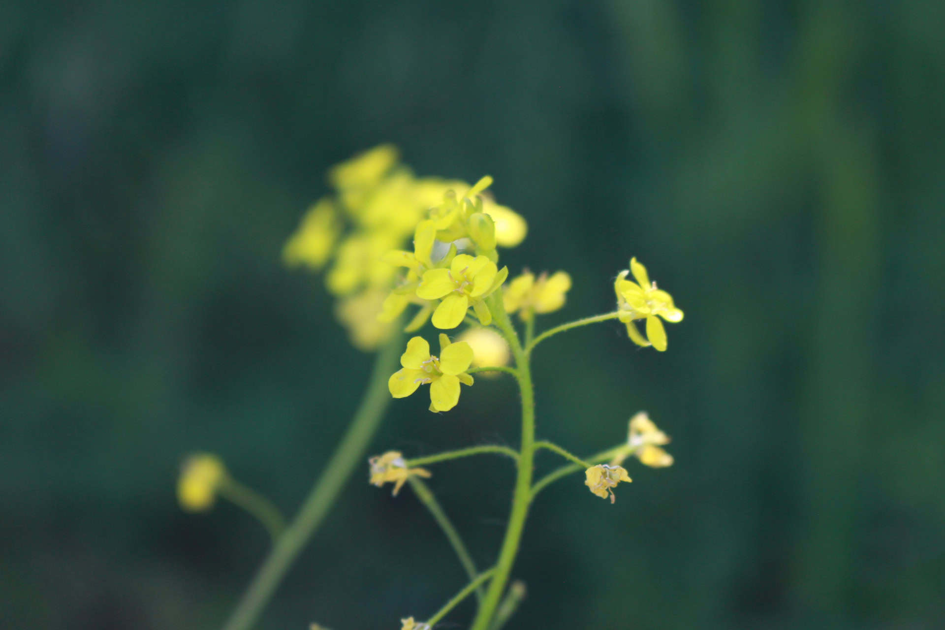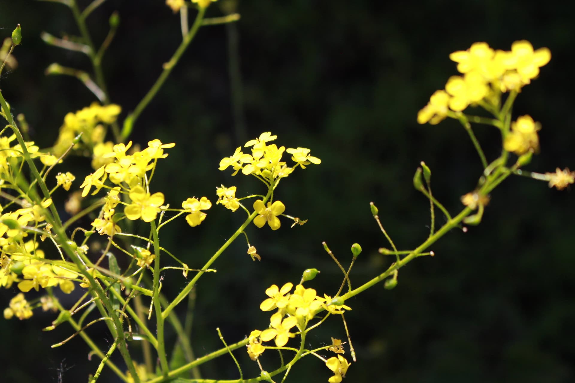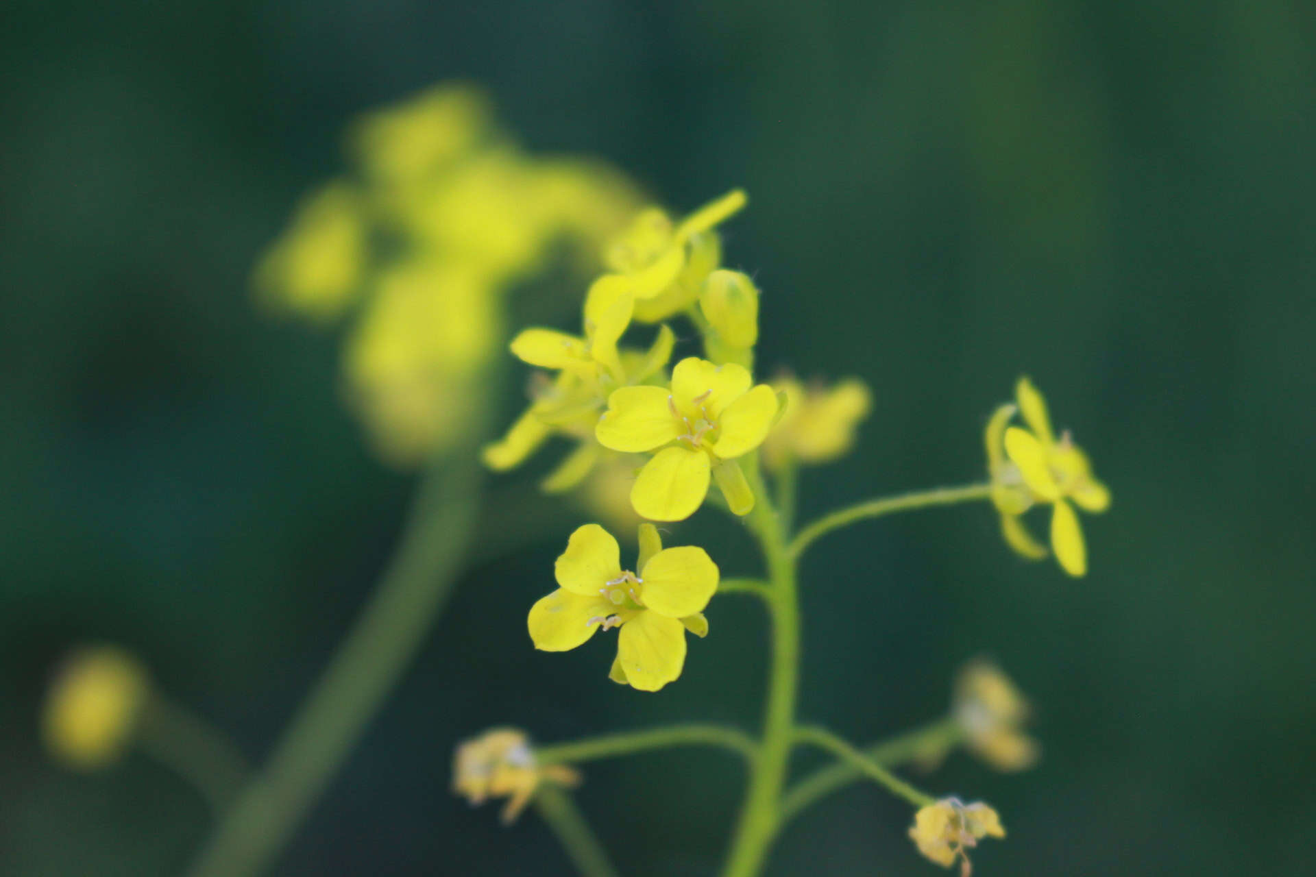 Im Frühling bis Frühsommer erscheinen die gelben Blüten der Winterkresse, die in typischer Kreuzblütenform aus vier Blütenblättern bestehen. Diese kleinen Blüten messen etwa 1 bis 2 cm im Durchmesser und gruppieren sich in trauben- oder doldenartigen Blütenständen an einem langen, aufrechten Stängel. Die Pflanze wächst aufrecht und erreicht eine Höhe von etwa 30 bis 70 cm mit einer buschigen Wuchsform.