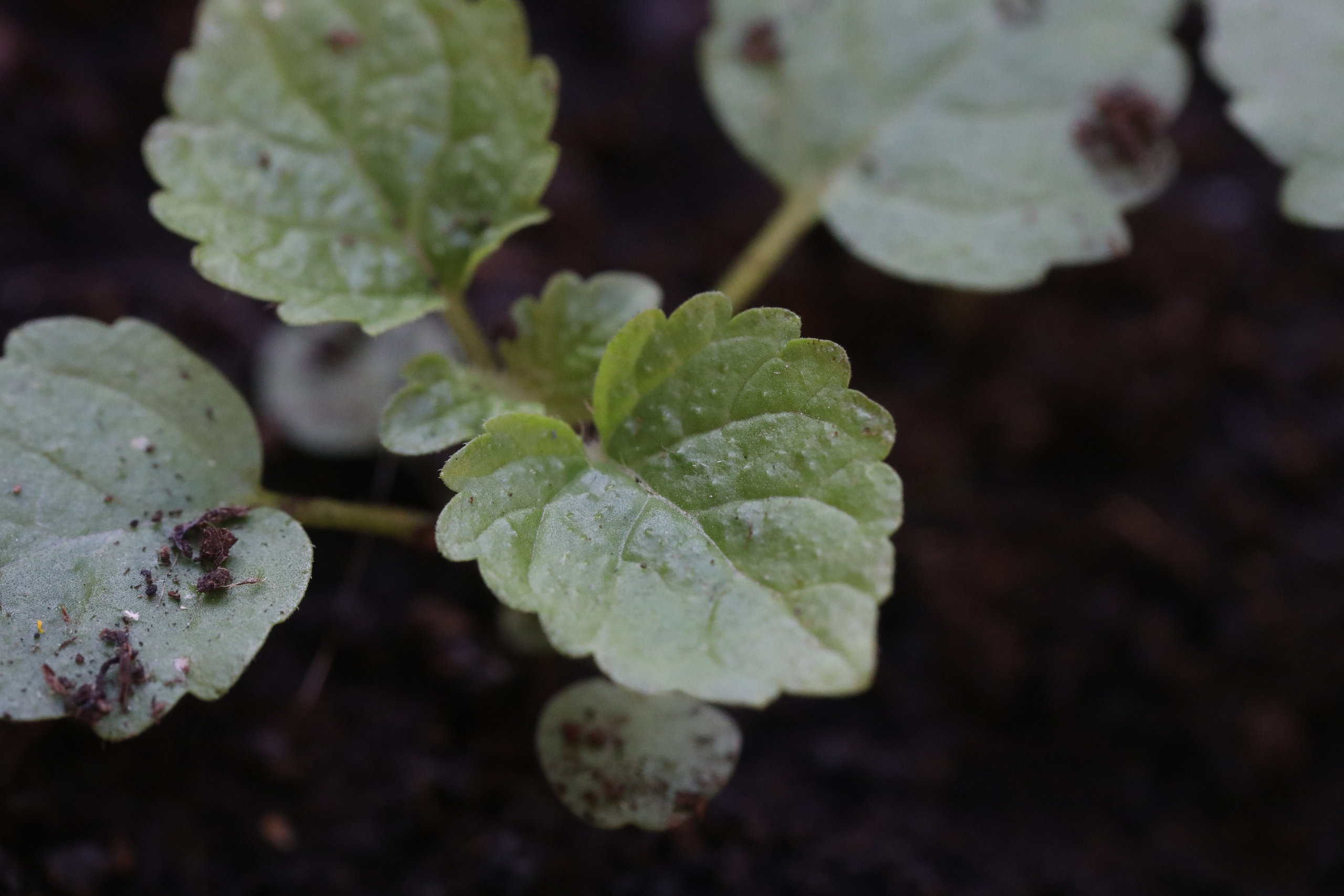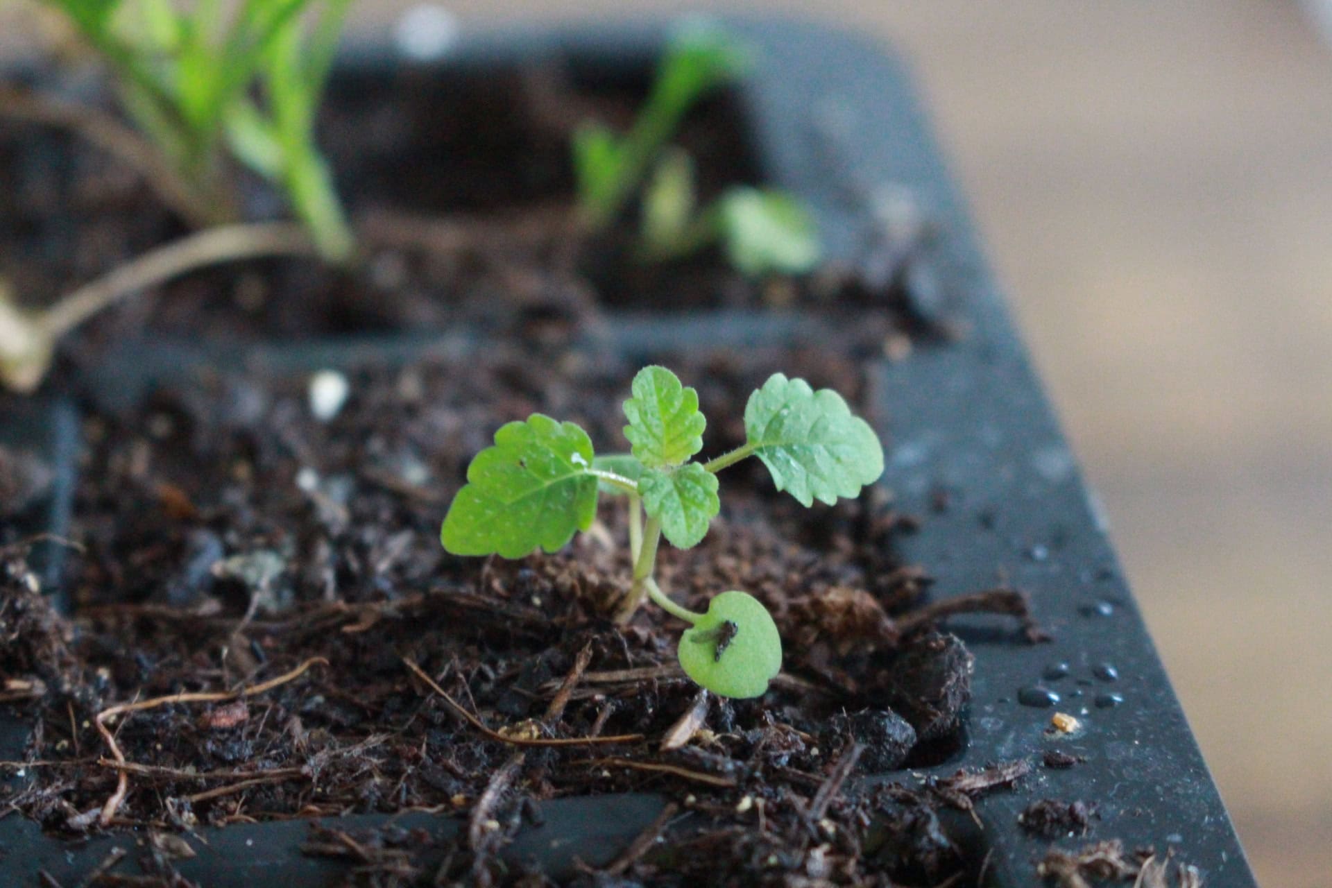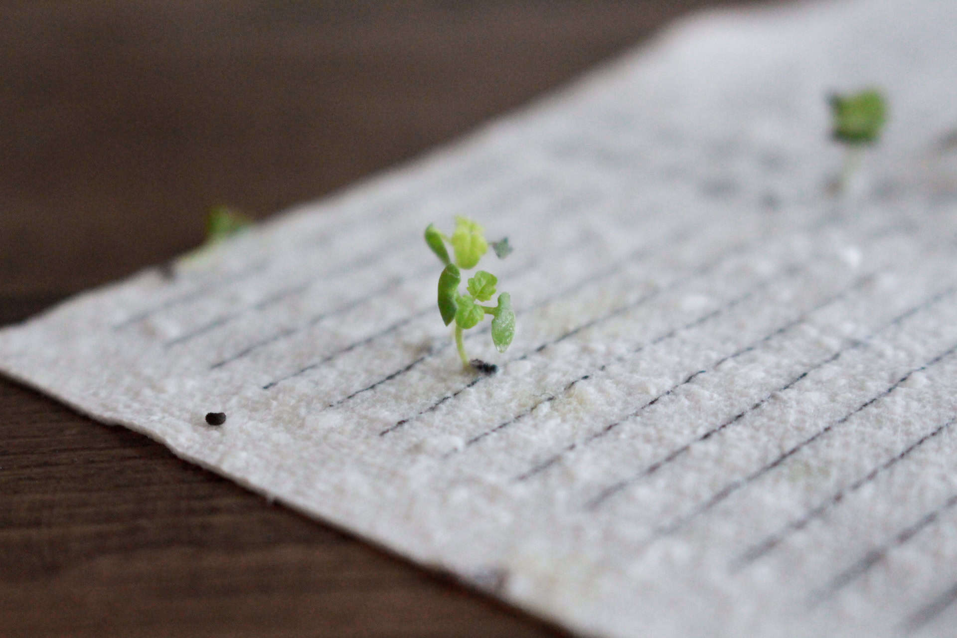 Die kleinen Keimlinge der Zitronenmelisse schauen schon schnell aus dem Saatpapier.