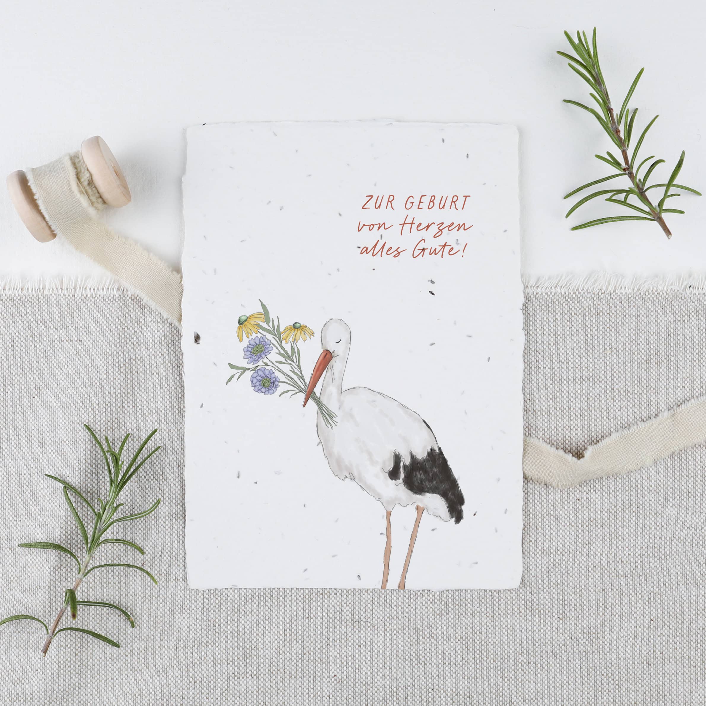 Eine Geburtskarte mit Storch und Blumenstrauß wachsendem Papier: In das handgeschöpfte Saatpapier haben wir Samen eingearbeitet, die nur darauf warten als wunderschönes Zeichen für das Heranwachsen eines neuen Lebens und als Symbol für Glück und Wachstum zu sprießen und zu blühen.