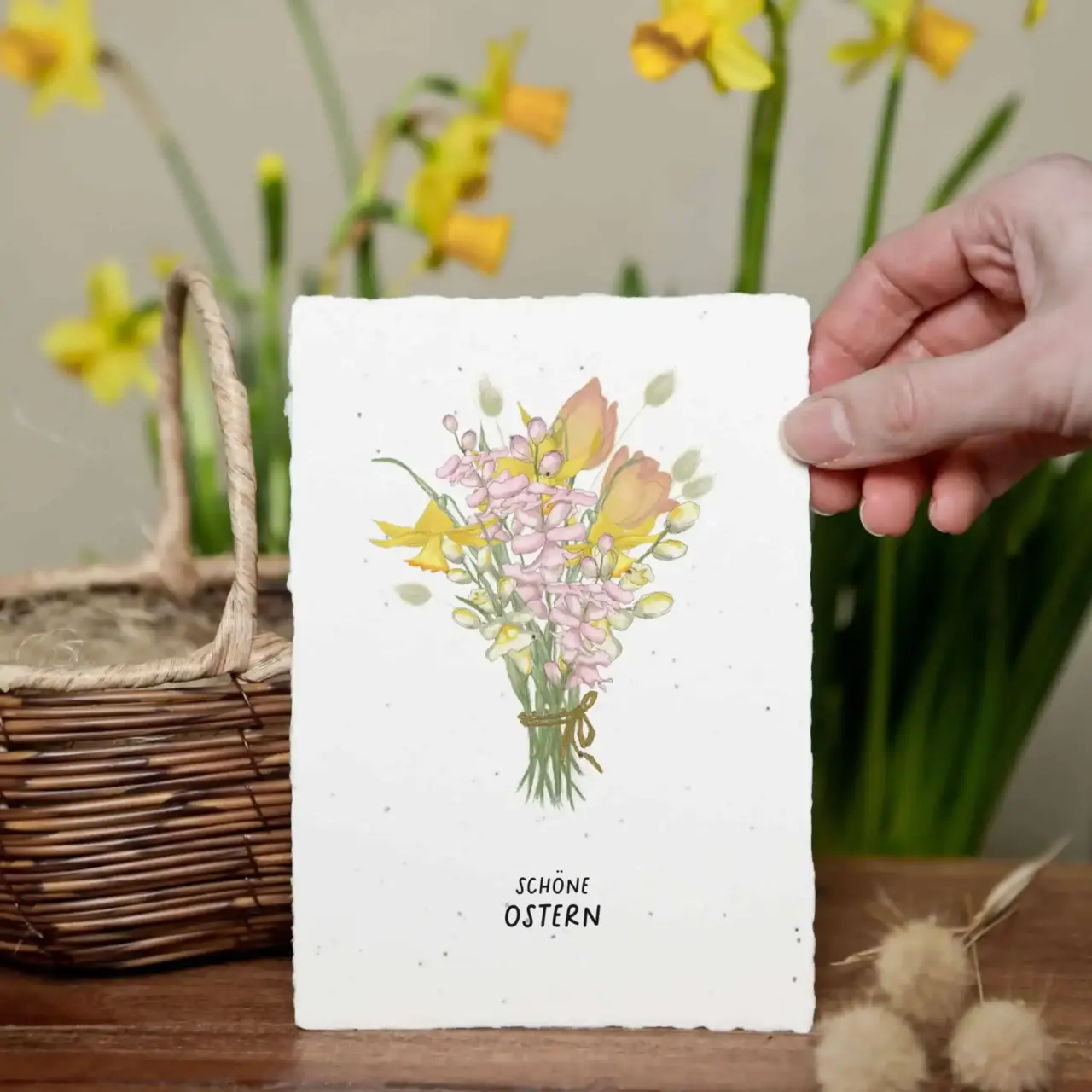 Mit viel Liebe zum Detail bringen wir klassische Ostermotive auf unser handgeschöpftes Saatpapier: Erst die Skizze, dann die Zeichnung, schließlich noch die Farbtupfer. In Kombination mit unserem Papierhandwerk, machen wir so jede Osterkarte zu einem kleinen Kunstwerk, das verschenkt werden und den Frühling willkommen heißen möchte.