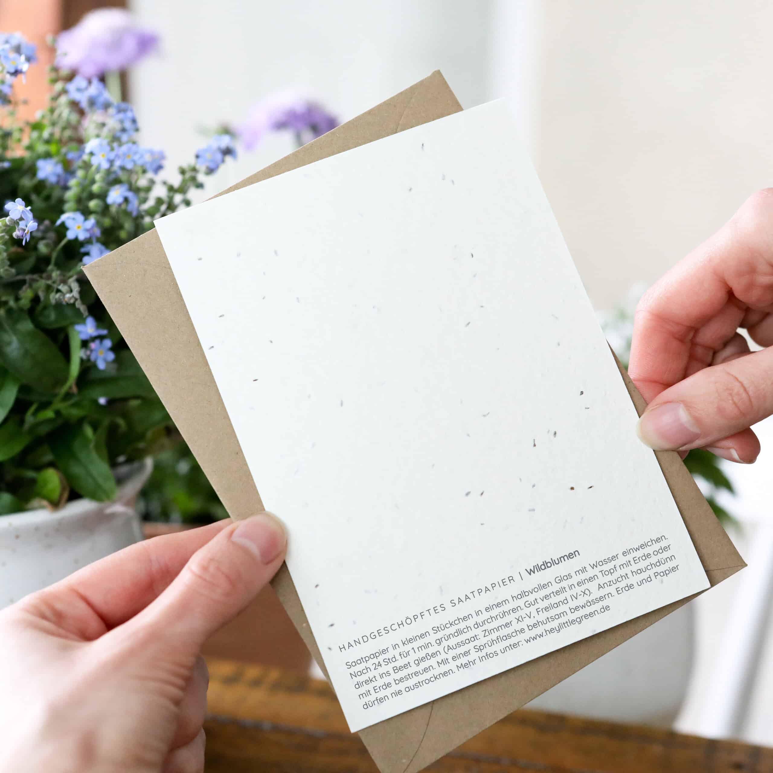 Auf der Rückseite unserer einpflanzbaren Karten befindet sich ausreichend Platz, um deinen Liebsten einen persönlichen Gruß zu verfassen. Für die Beschriftung empfehlen wir einen Kugelschreiber oder idealerweise einen Stift auf Basis von Lebensmittelfarben. Da wir das einpflanzbare Saatpapier der Karten ohne die Beigabe chemischer Zusatzstoffe fertigen, eignen sich unsere Karten nur bedingt zum Beschriften mit Tinte, weil Tinte auf handgeschöpftem Papier schnell verläuft bzw. "ausblutet".