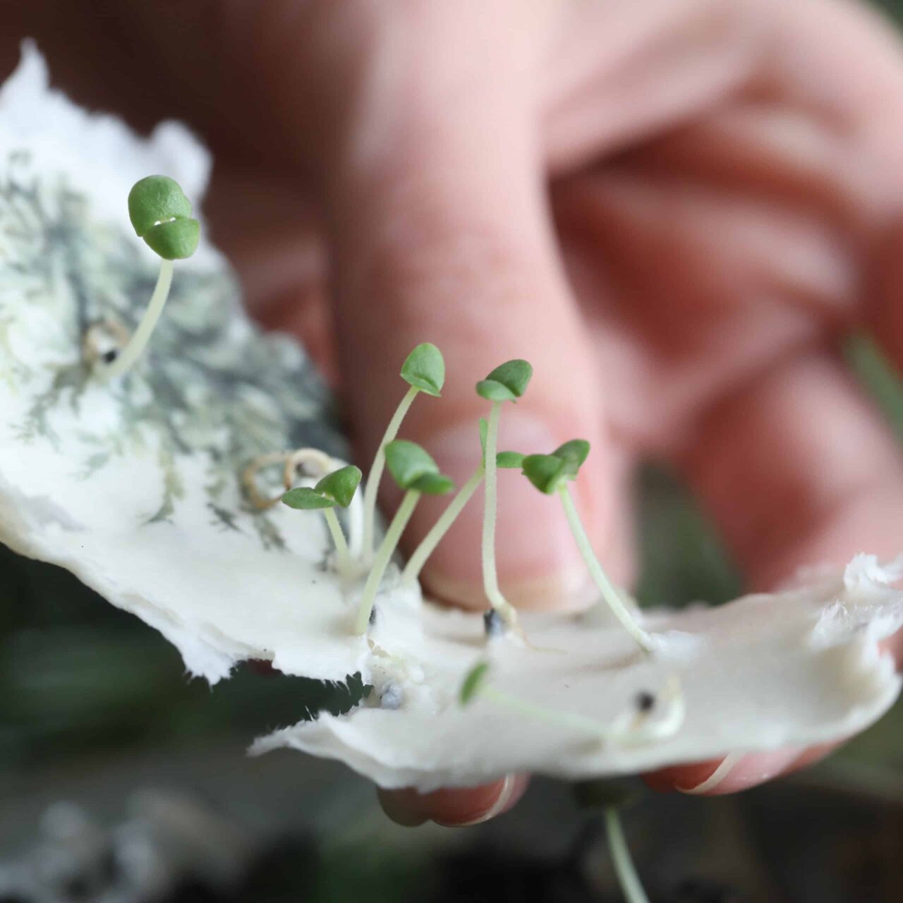 Die Karten sind zu 100% aus unserem handgeschöpften Saatpapier. Das bedeutet: Du kannst jede Grußkarte vollständig einpflanzen. Dazu reißt du das Saatpapier in kleine Stückchen und legst diese für 24 Std. in ein Glas mit Wasser (halbvoll). Danach rührst du mit einem Teelöffel das Glas nochmal für 1 min. durch, sodass möglichst eine breiartige Masse entsteht. Das Saatpapier-Wasser-Gemisch gießt du nun gut verteilt auf einen Topf mit Erde, in eine Anzuchtschale oder direkt ins Beet. Beachte dabei den richtigen Aussaatzeitpunkt, insbesondere bei einer Direktsaat im Freien. Streue dann ein wenig Erde hauchdünn über das Saatpapier. Das Papier sollte aber noch ausreichend Licht erhalten. Halte die Erde und das Papier anschließend dauerhaft nass, indem du eine Sprühflasche verwendest. Erde und Papier dürfen nie (!) austrocknen, ansonsten kann sich die Pflanze nicht mehr entwickeln. Je nach Sorte und Witterung erfolgt die Keimung dann innerhalb weniger Tage bis Wochen. Eine übersichtliche PDF-Anleitung kannst du hier downloaden.
