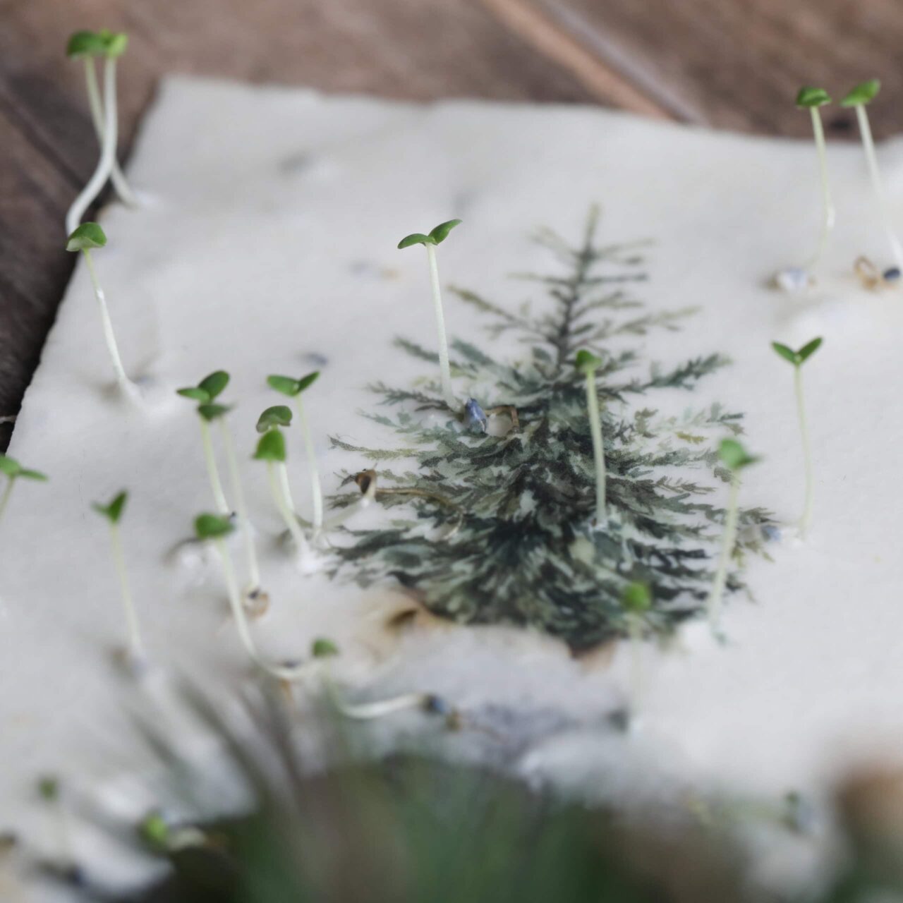Eine Weihnachtskarte mit einem Tannenbaum aus wachsendem Papier: In das handgeschöpfte Saatpapier haben wir Samen eingearbeitet, die nur darauf warten als nachhaltiger Weihnachtsgruß zum Leben erweckt zu werden.